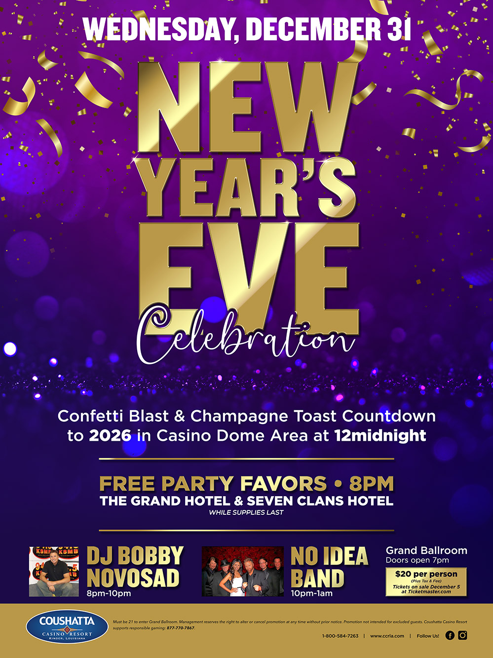 Coushatta Casino Resort reserves the right to alter or cancel any event or promotion without prior notice. Offers are not intended for excluded guests. Images shown may not be an exact representation of offers.