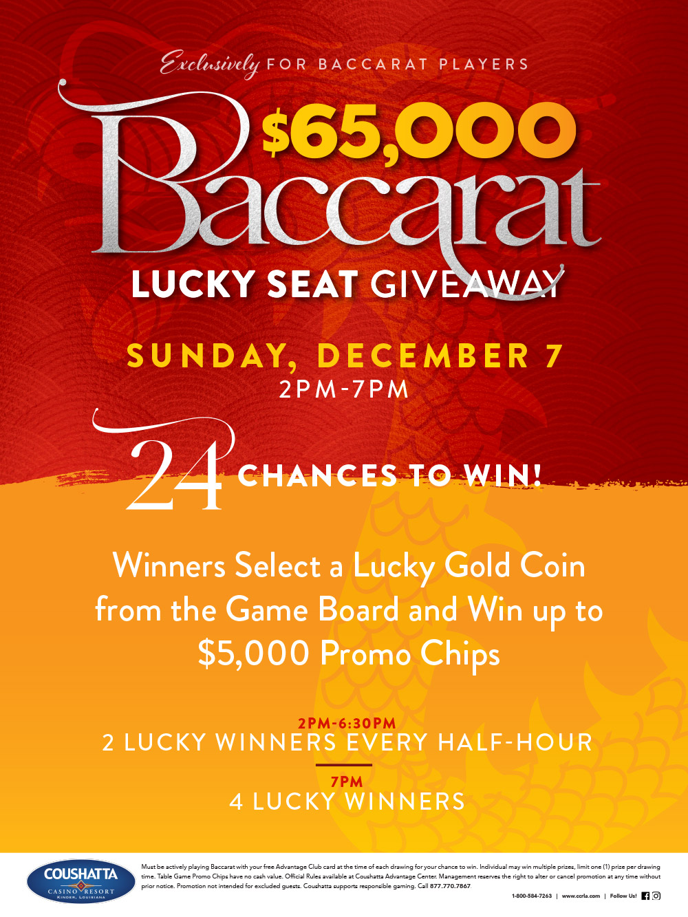 Must be actively playing Baccarat with your free Advantage Club card at the time of each drawing for your chance to win. Individual may win multiple prizes, limit one (1) prize per drawing time. Table Game Promo Chips have no cash value. Official Rules available at Coushatta Advantage Center.