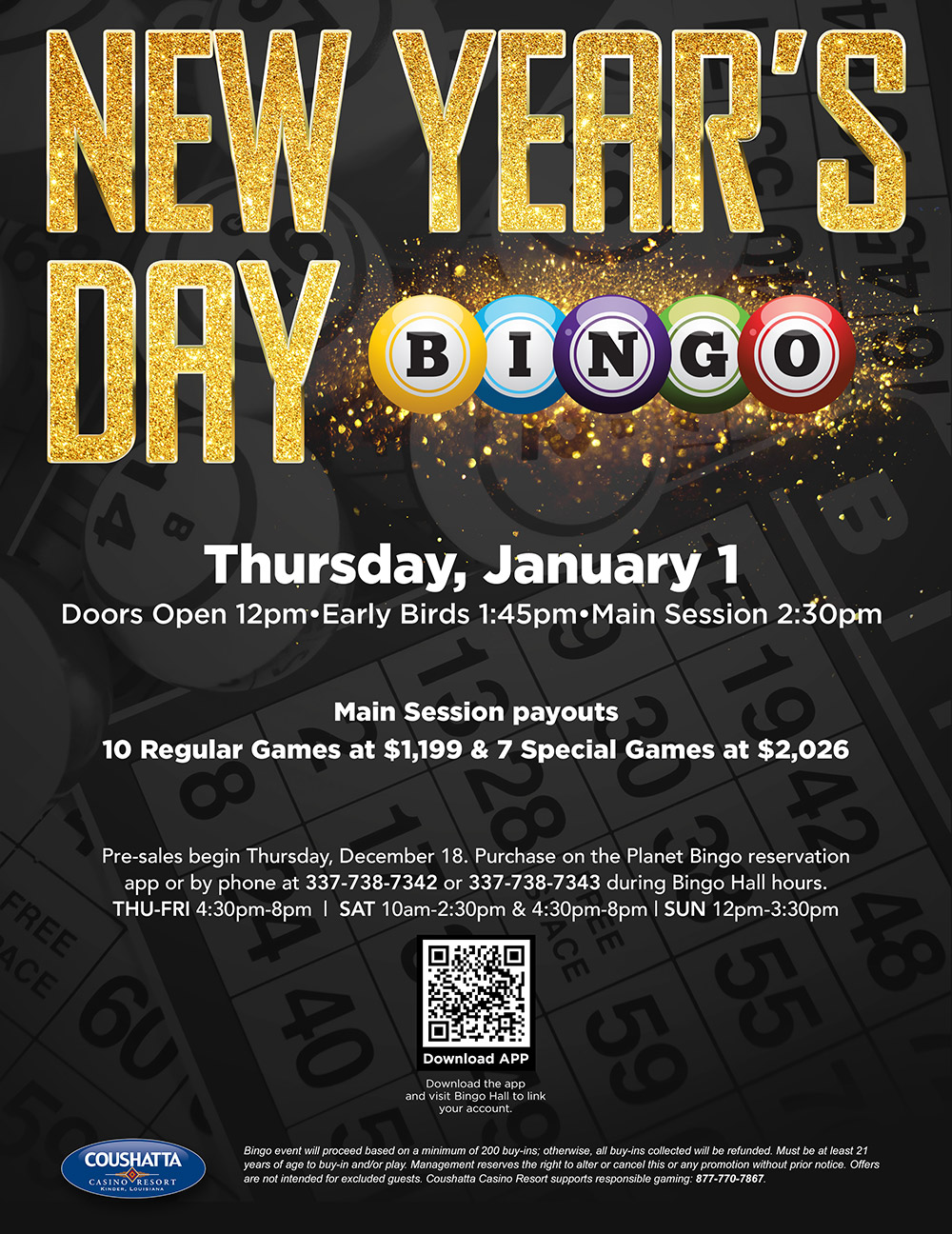 Pre-sales begin Thursday, December 18. Purchase on the Planet Bingo® reservation app or by phone at 337-738-7342 or 337-738-7343 during Bingo Hall hours. Thu-Fri: 4:30pm-8pm | Sat 10am-2:30pm & 4:30pm-8pm | Sun 12pm-3:30pm