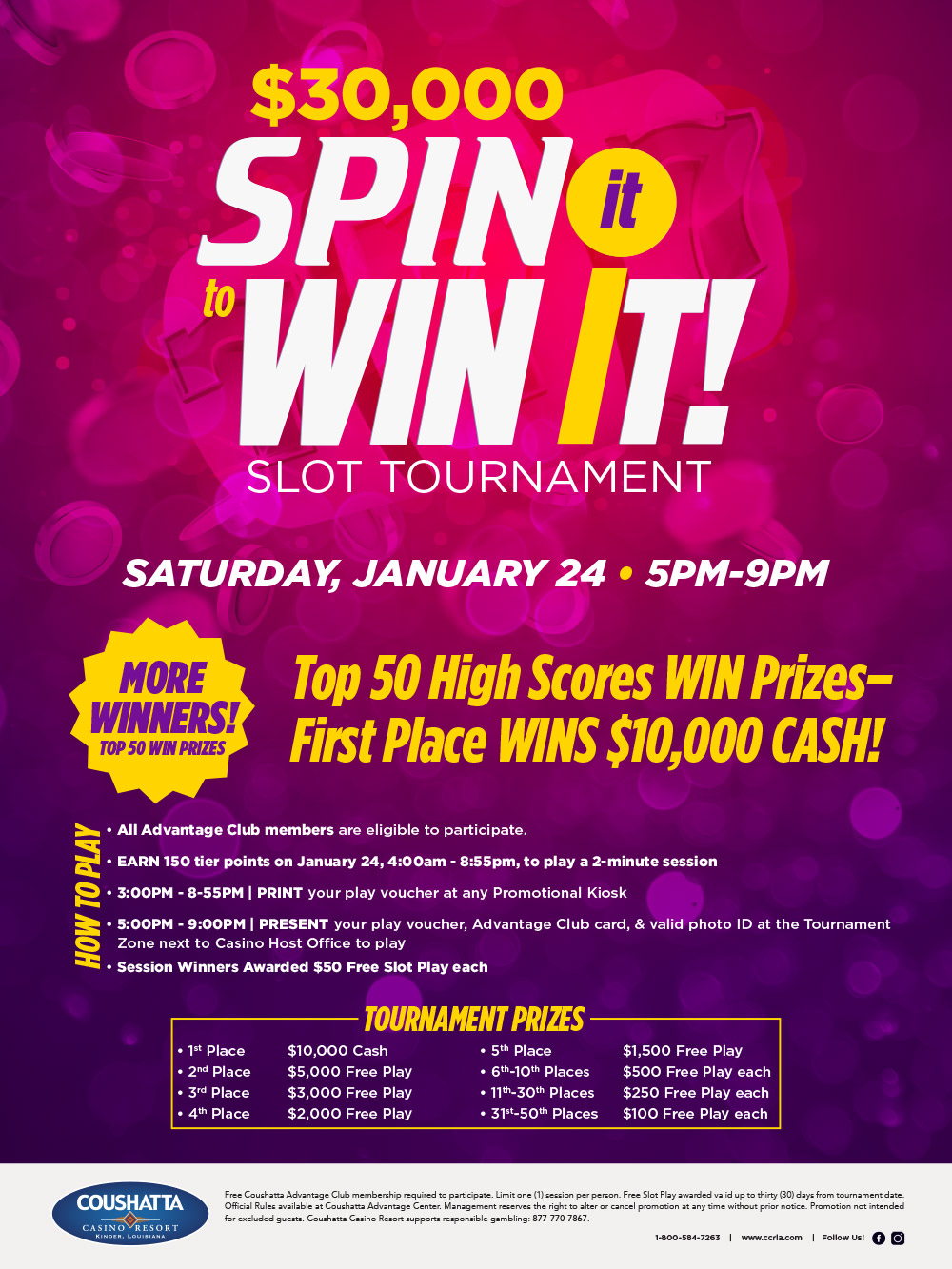 Free Coushatta Advantage Club membership required to participate. Limit one (1) session per person. Free Slot Play awarded valid up to thirty (30) days from tournament date. Official Rules available at Coushatta Advantage Center.