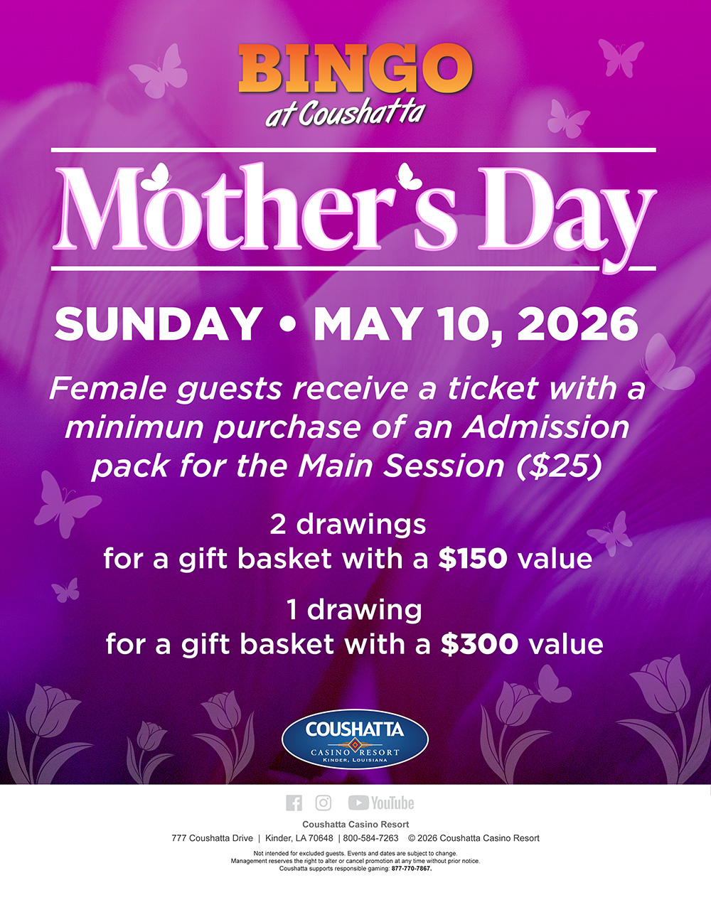 Coushatta Casino Resort reserves the right to alter or cancel any event or promotion without prior notice. Offers are not intended for excluded guests. Images shown may not be an exact representation of offers.