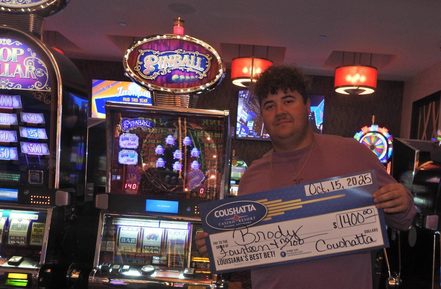 Congratulations to Brody--on October 15, 2025 this lucky guest hit the jackpot while playing the Pinball slot game and won $1,400!