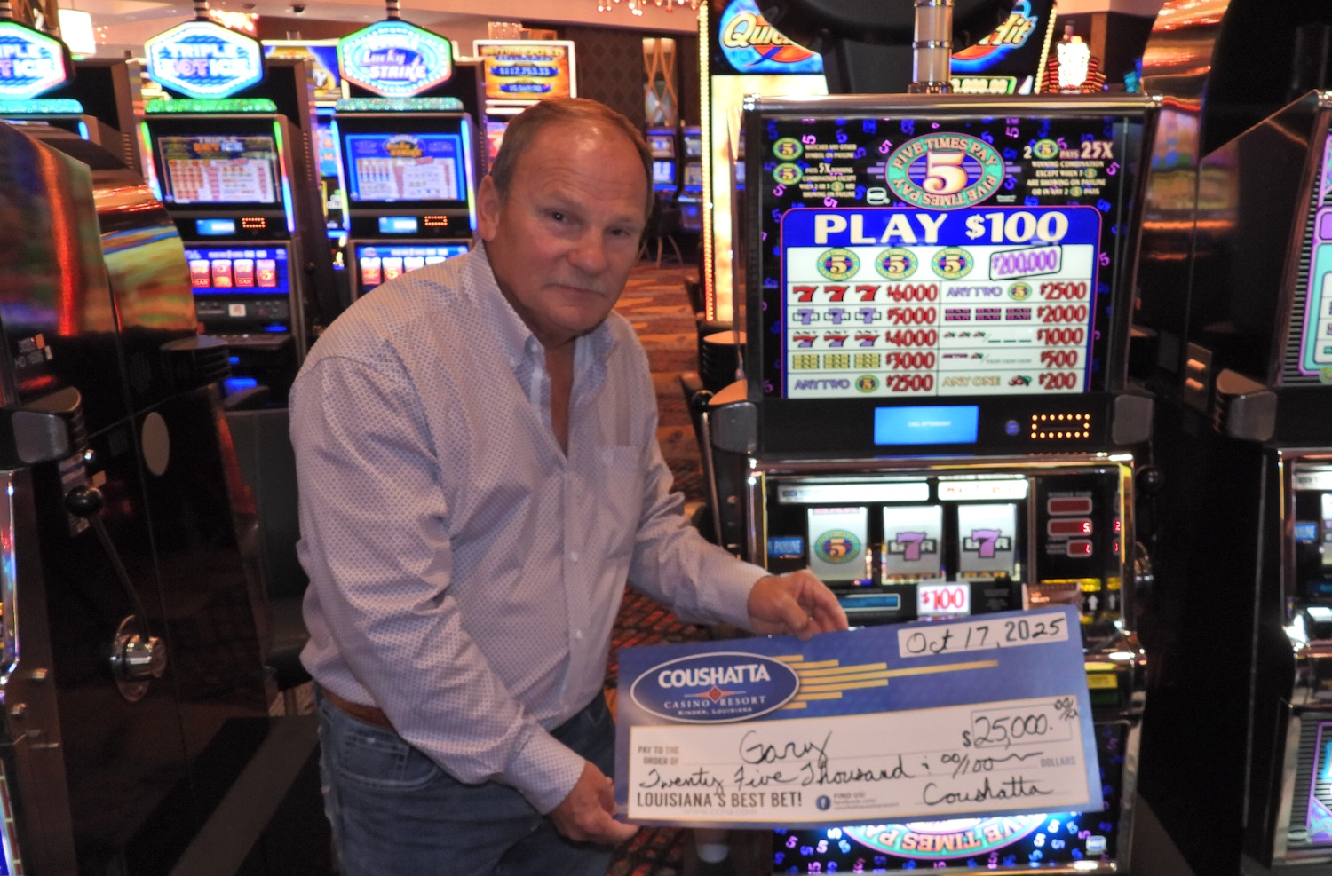 Congratulations to Gary--on October 17, 2025 this lucky guest hit the jackpot while playing the Five Times Pay slot game and won $25,000!