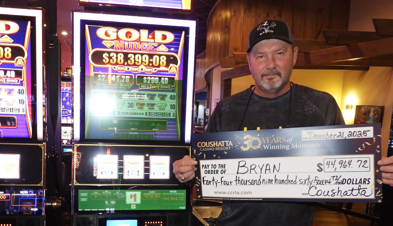 Congratulations to Bryan--on December 21, 2025 this lucky guest hit the jackpot while playing the Gold Nudge slot game and won $44,964!