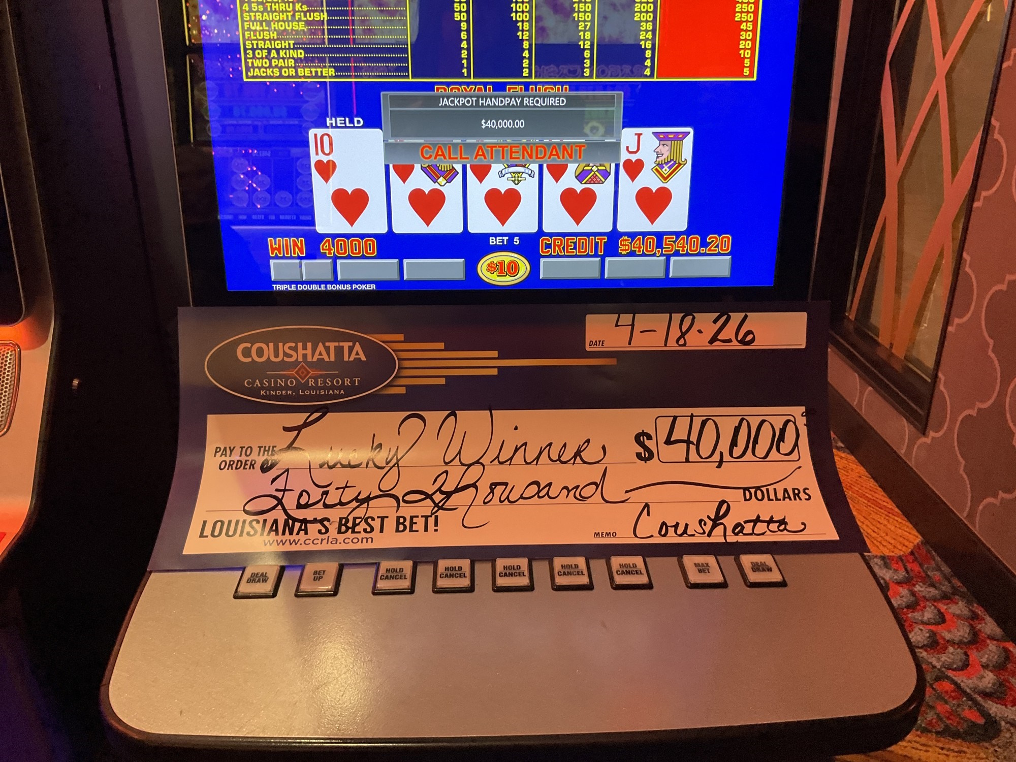 Congratulations to a Lucky Winner--on April 18, 2026 this guest hit the jackpot while playing the Triple Double Bonus video poker slot game and won $40,000!