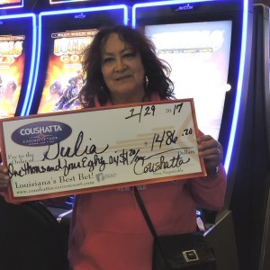 Congratulations to Rebecca from Texas-–on January 29, this lucky guest hit the jackpot on a Coushatta War Pony slot game and won $1,543!
