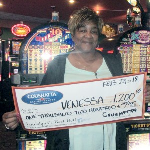 Congratulations to Venessa from Texas-–on February 23, this lucky guest hit the jackpot on a 10 Times Pay Red White and Blue slot game and won $1,200!