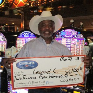 Congratulations to Leonard C. from Texas-–on March 23, this lucky guest hit the jackpot on a Double Times Pay slot game and won $2,400!