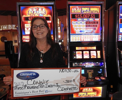 Congratulations to Connie--on November 30, 2022 this lucky guest hit the jackpot while playing the Blazing 7s slot game and won $3,010!