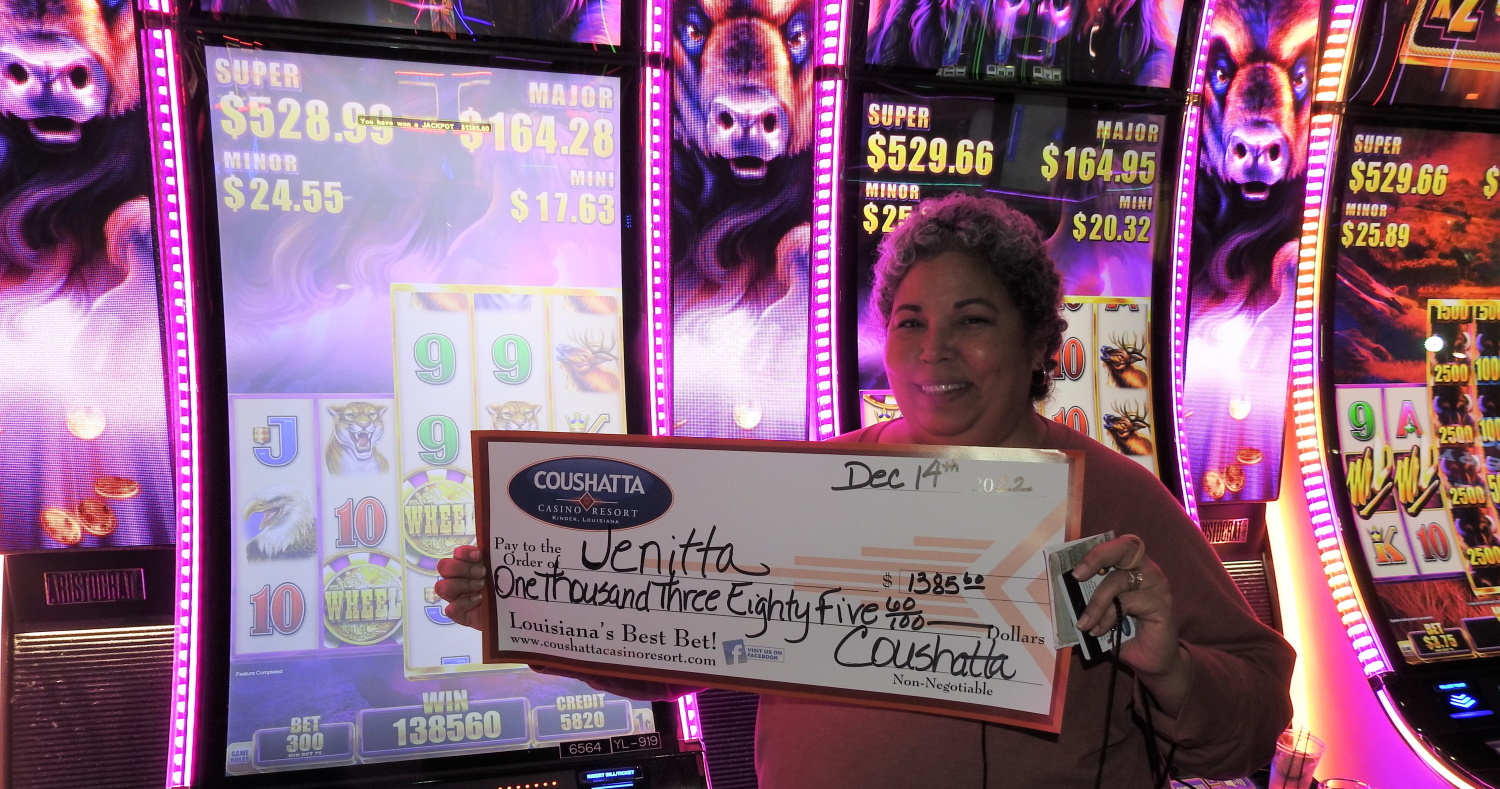 Congratulations to Jenitta--on December 14, 2022 this lucky guest hit the jackpot while playing the Wild Wild Buffalo slot game and won $1,385!