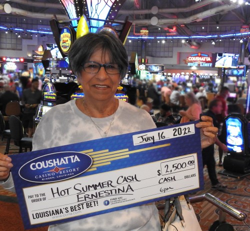 Congratulations to Ernestina--on July 16, 2022 this lucky guest hit the jackpot while playing in Coushatta's $100,000 Hot Summer Cash Giveaway and won $2,500!