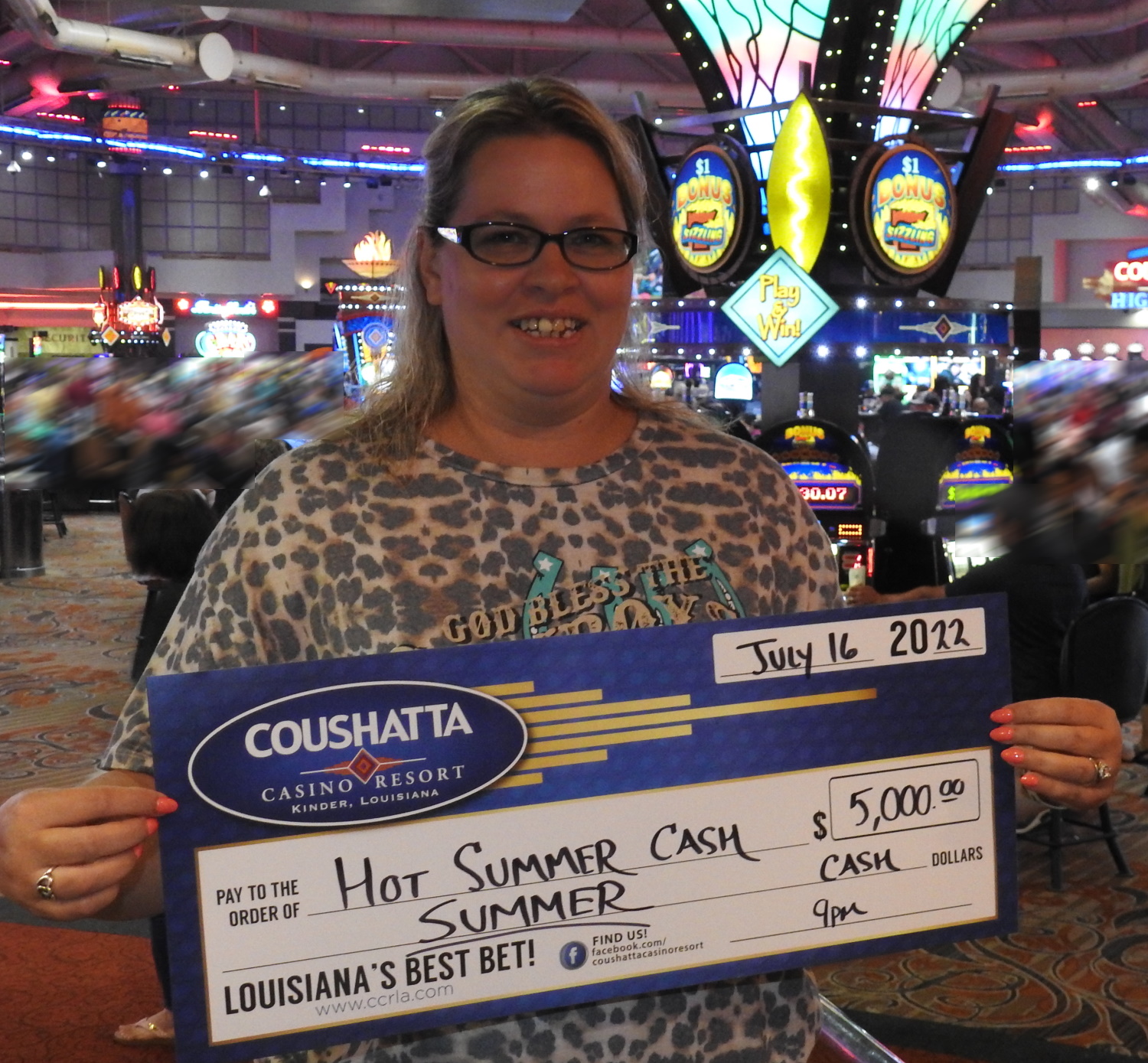 Congratulations to Summer--on July 16, 2022 this lucky guest hit the jackpot while playing in Coushatta's $100,000 Hot Summer Cash Giveaway and won $5,000!