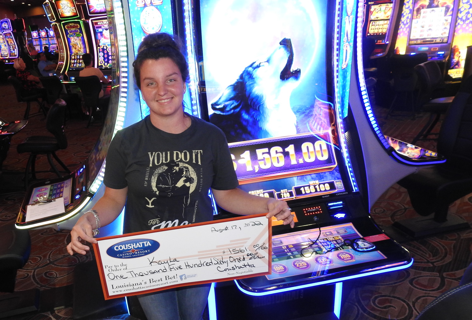 Congratulations to Kayla--on August 17, 2022 this lucky guest hit the jackpot while playing the Timber Wolf Diamond slot game and won $1,561!