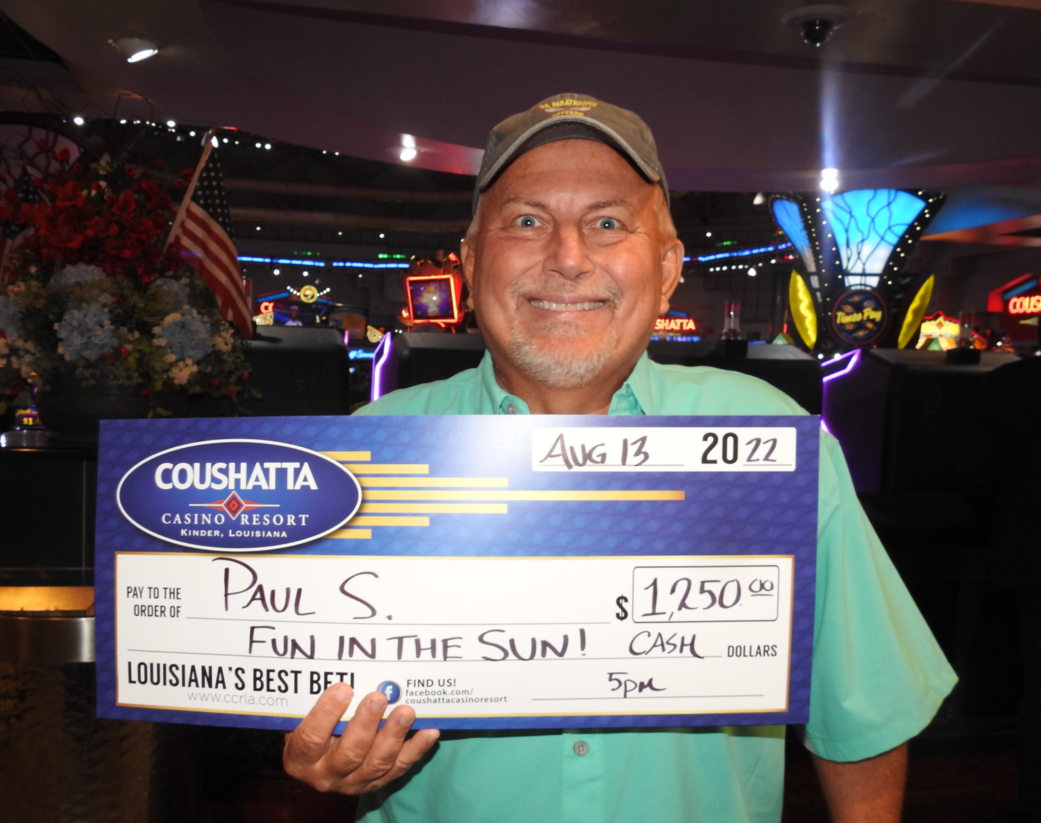 Congratulations to Paul--on August 13, 2022 this lucky guest hit the jackpot while playing in Coushatta's $100,000 Fun in the Sun Giveaway and won $1,250!