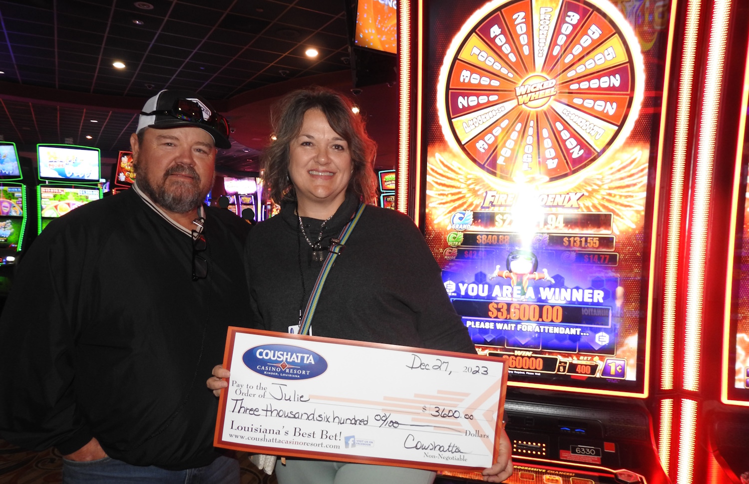 Congratulations to Julie--on December 27, 2023 this lucky guest hit the jackpot while playing the Wicked Wheel Fire Phoenix slot game and won $3,600!