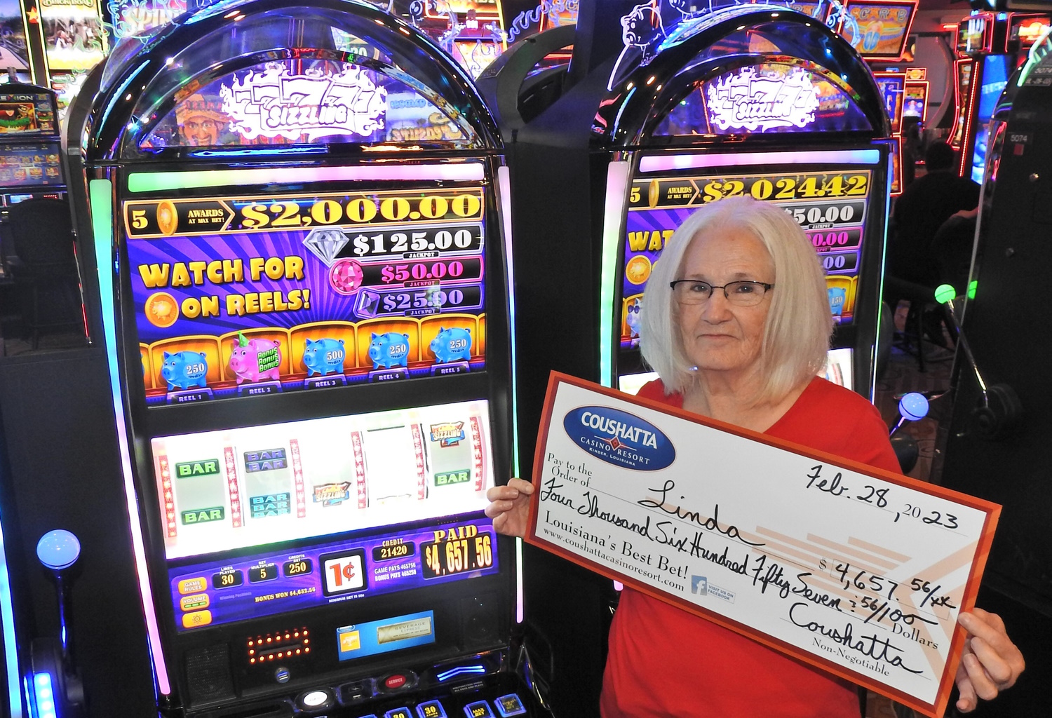 Congratulations to Linda--on February 28, 2023 this lucky guest hit the jackpot while playing the Piggy Parade slot game and won $4,657!