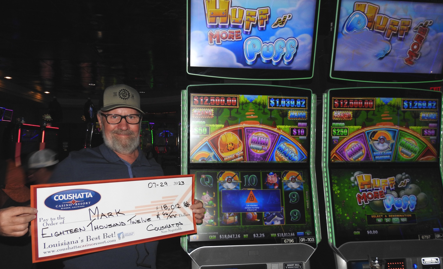 Congratulations to Mark--on July 28, 2023 this lucky guest hit the jackpot while playing the Huff 'n More Puff slot game and won $18,012!
