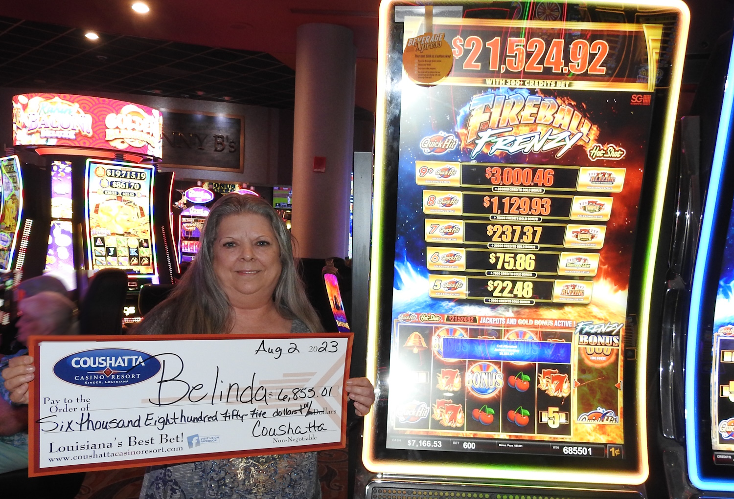 Congratulations to Belinda--on August 2, 2023 this lucky guest hit the jackpot while playing the Twin Fire Frenzy slot game and won $6,855!