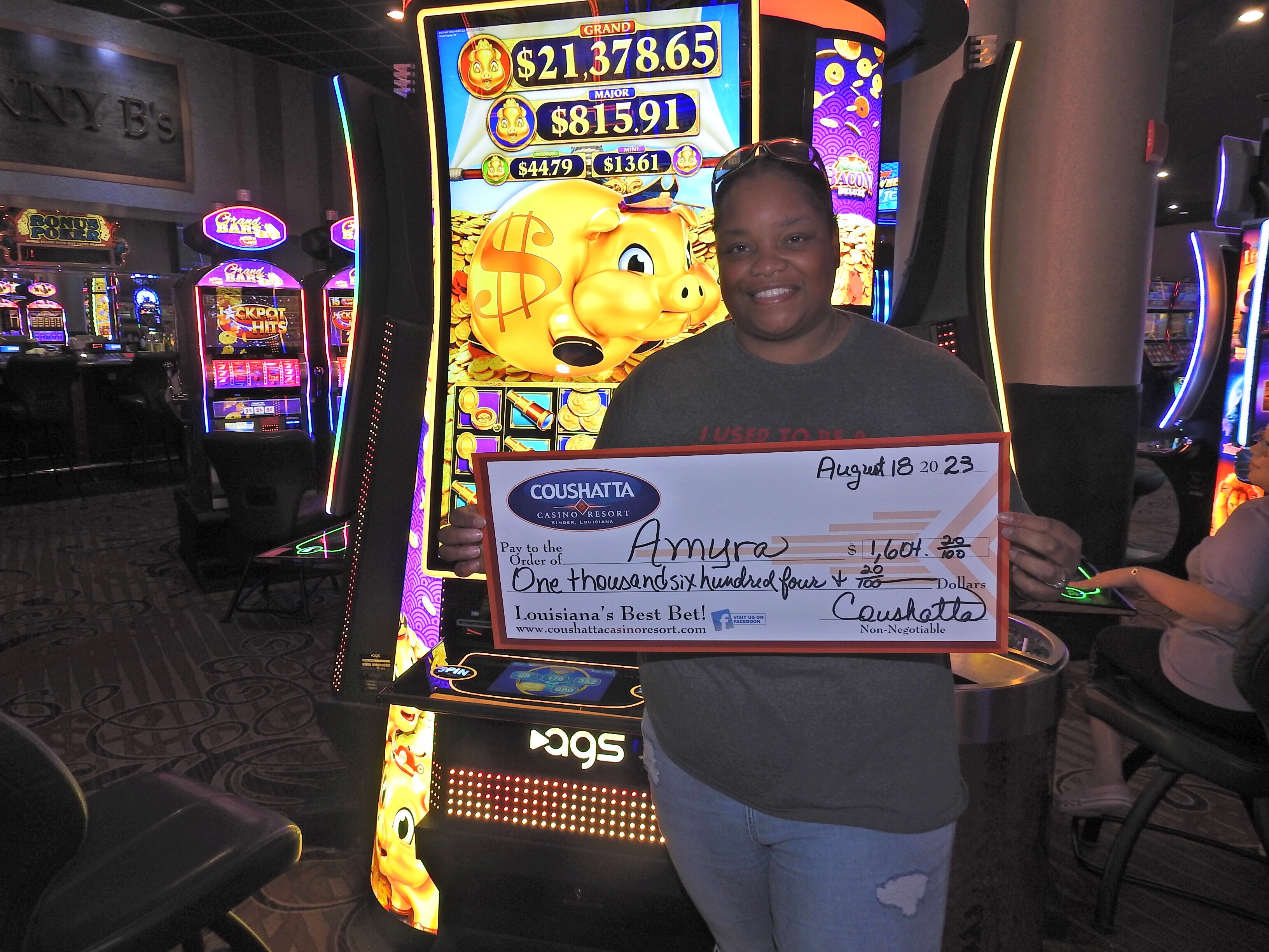 Congratulations to Amyra--on August 18, 2023 this lucky guest hit the jackpot while playing the Rakin Bacon Deluxe slot game and won $1,604.20!