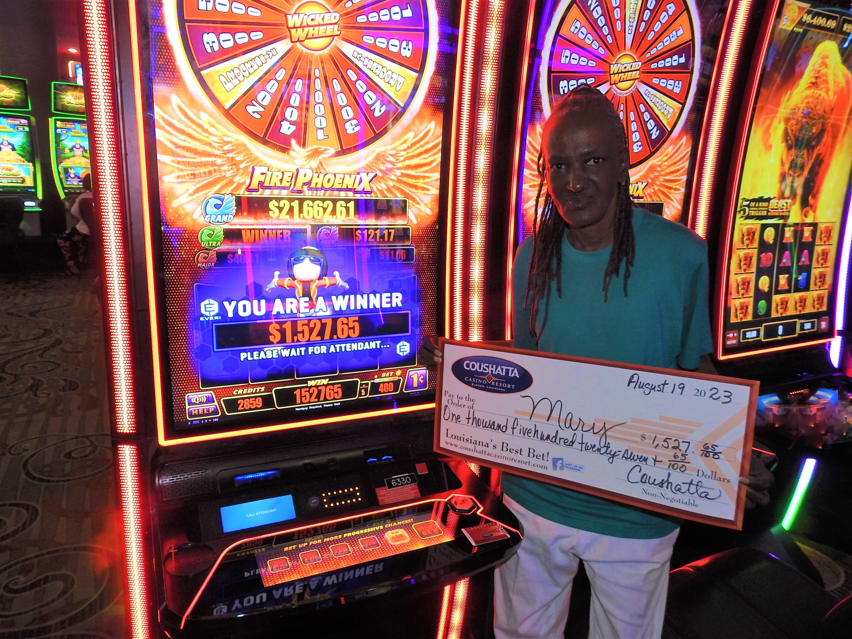 Congratulations to Mary--on August 19, 2023 this lucky guest hit the jackpot while playing the Fire Phoenix slot game and won $1,527.65!