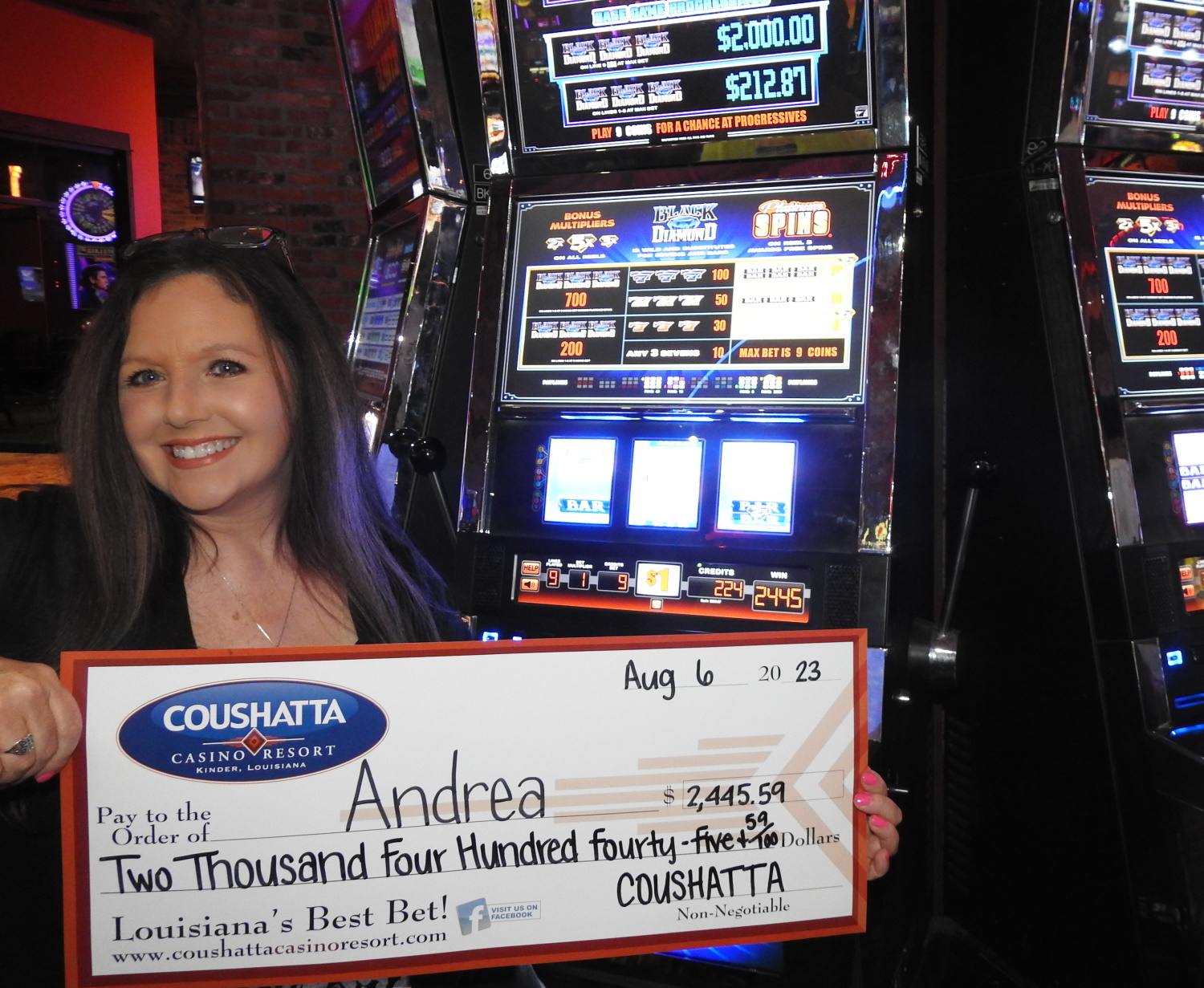 Congratulations to Andrea--on August 6, 2023 this lucky guest hit the jackpot while playing the Black Diamond slot game and won $2,445!