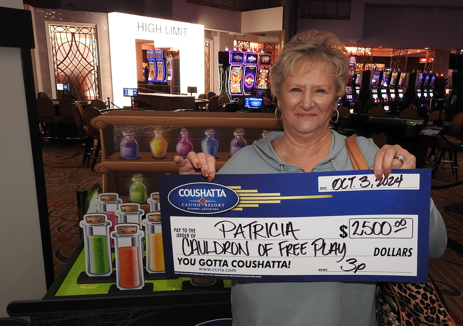 Congratulations to Patricia--on October 3, 2024 this lucky guest hit the jackpot while playing in Coushatta's Cauldron of Free Play Hot Seat Giveaway and won $2,500 in Free Slot Play!