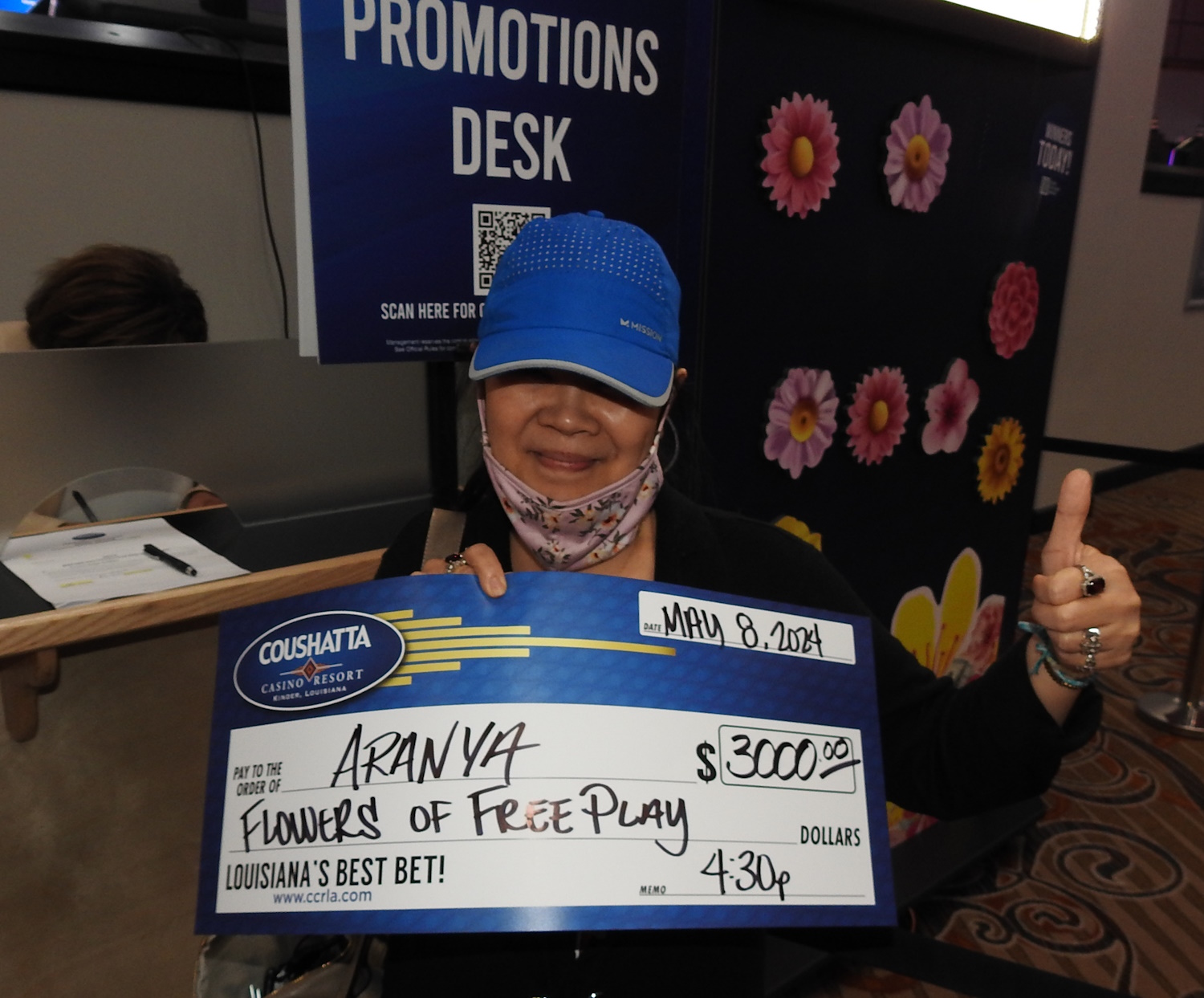 Congratulations to Aranya--on May 8, 2024 this lucky guest hit the jackpot while playing in the $100,000 May Flowers of Free Play Giveaway and won $3,000 in Promo Chips!