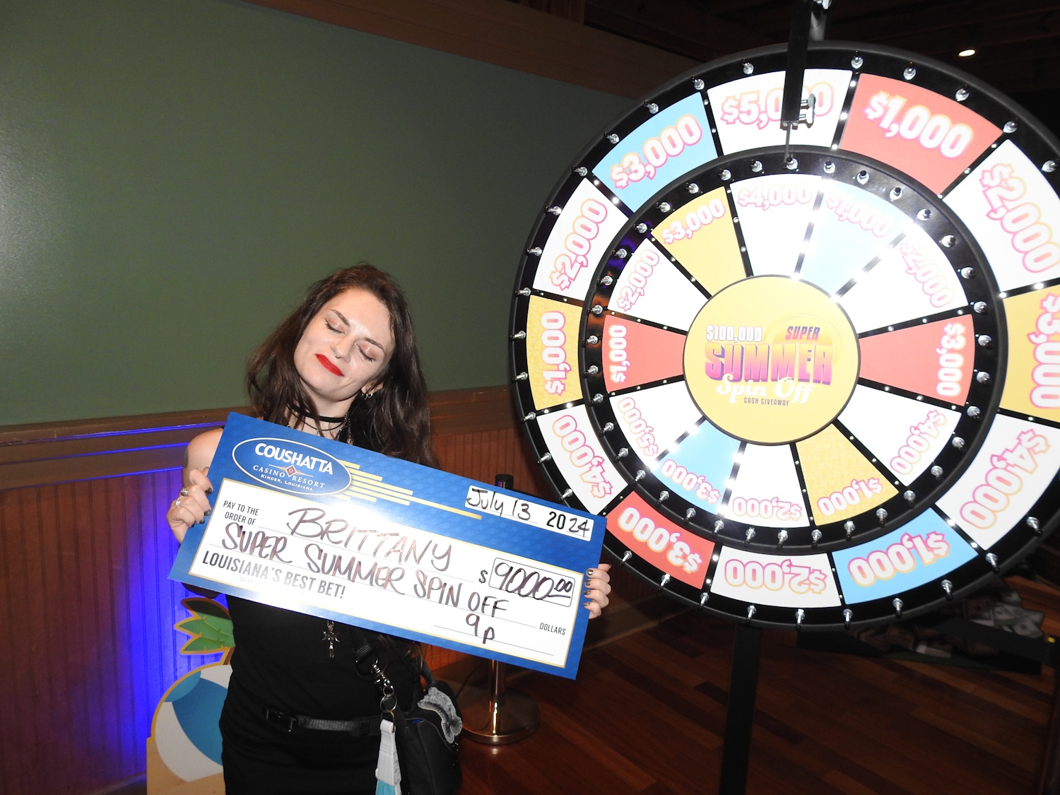Congratulations to Brittany--on July 13, 2024 this lucky guest hit the jackpot while playing in Coushatta's Super Summer Spinoff Cash Giveaway and won $9,000!
