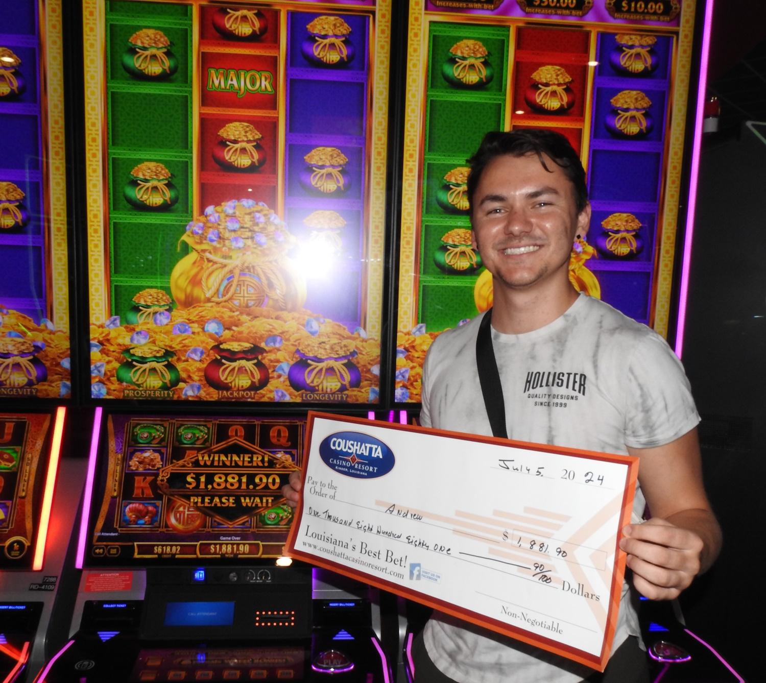 Congratulations to Andrew--on July 5, 2024 this lucky guest hit the jackpot while playing the Fu Dai Lian Lian slot game and won $1,881!