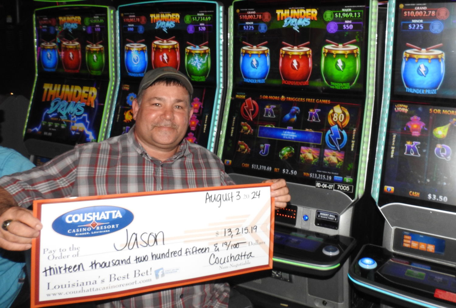 Congratulations to Jason--on August 3, 2024 this lucky guest hit the jackpot while playing the Thunder Drums slot game and won $13,215!