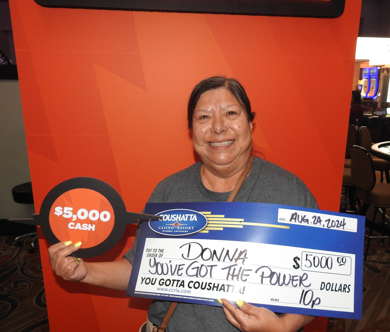 Congratulations to Donna--on August 24, 2024 this lucky guest hit the jackpot while playing in the Coushatta's $125,000 You've Got the Power Giveaway and won a portable generator plus $5,000!