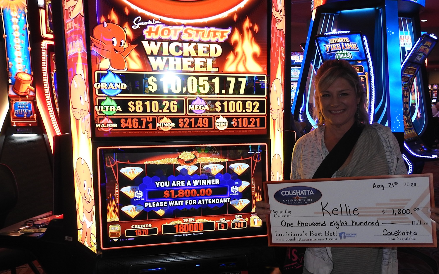 Congratulations to Kellie--on August 21, 2024 this lucky guest hit the jackpot while playing the Hot Stuff Wicked Wheel slot game and won $1,800!