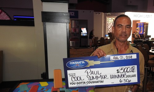 Congratulations to Paul--on August 21, 2024 this lucky guest hit the jackpot while playing in the Coushatta's $100,000 Cool Summer Hot Seat Giveaways and won $500 in Free Slot Play!