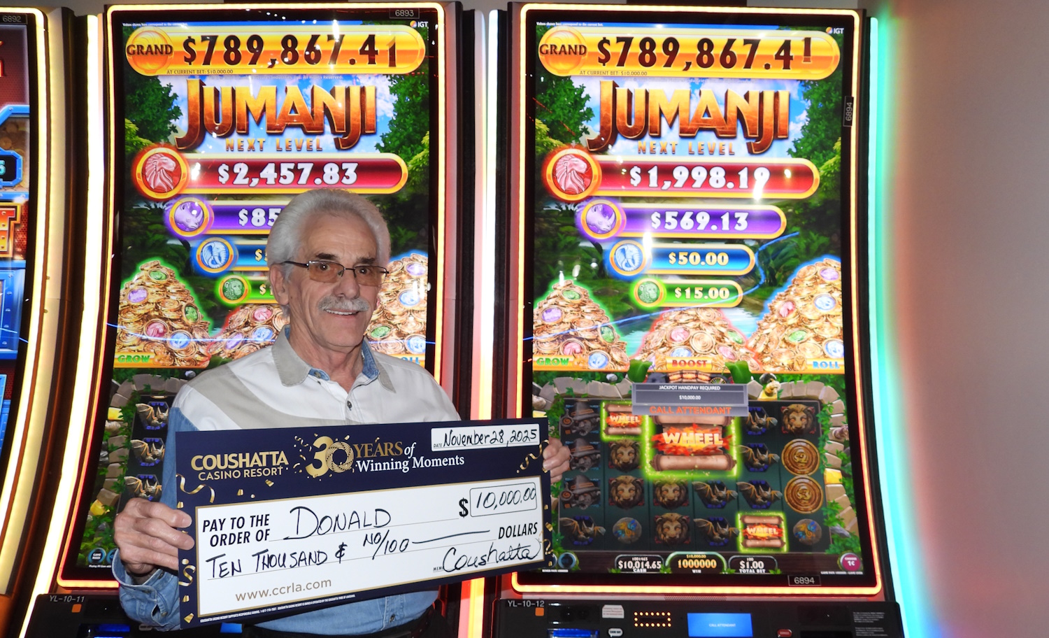 Congratulations to Donald--on November 28, 2025 this lucky guest hit the jackpot while playing the Jumanji Next Level slot game and won $10,000!