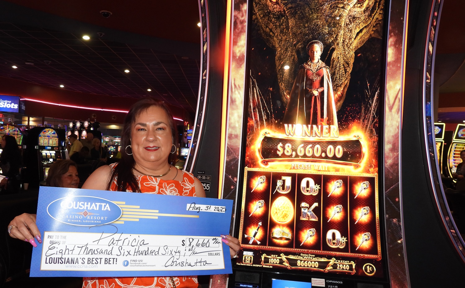 Congratulations to Patricia--on August 31, 2025 this lucky guest hit the jackpot while playing the House of the Dragon slot game and won $8,660!