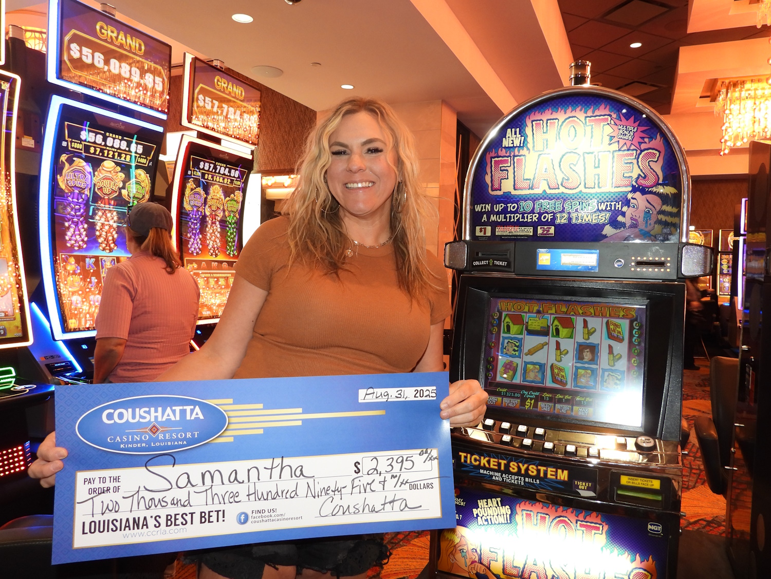 Congratulations to Samantha--on August 31, 2025 this lucky guest hit the jackpot while playing the Hot Flashes slot game and won $2,395!