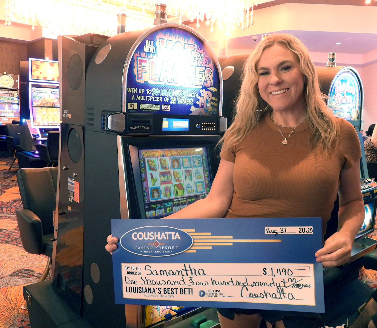 Congratulations to Samantha--on August 31, 2025 this lucky guest hit the jackpot while playing the Hot Flashes slot game and won $1,490!