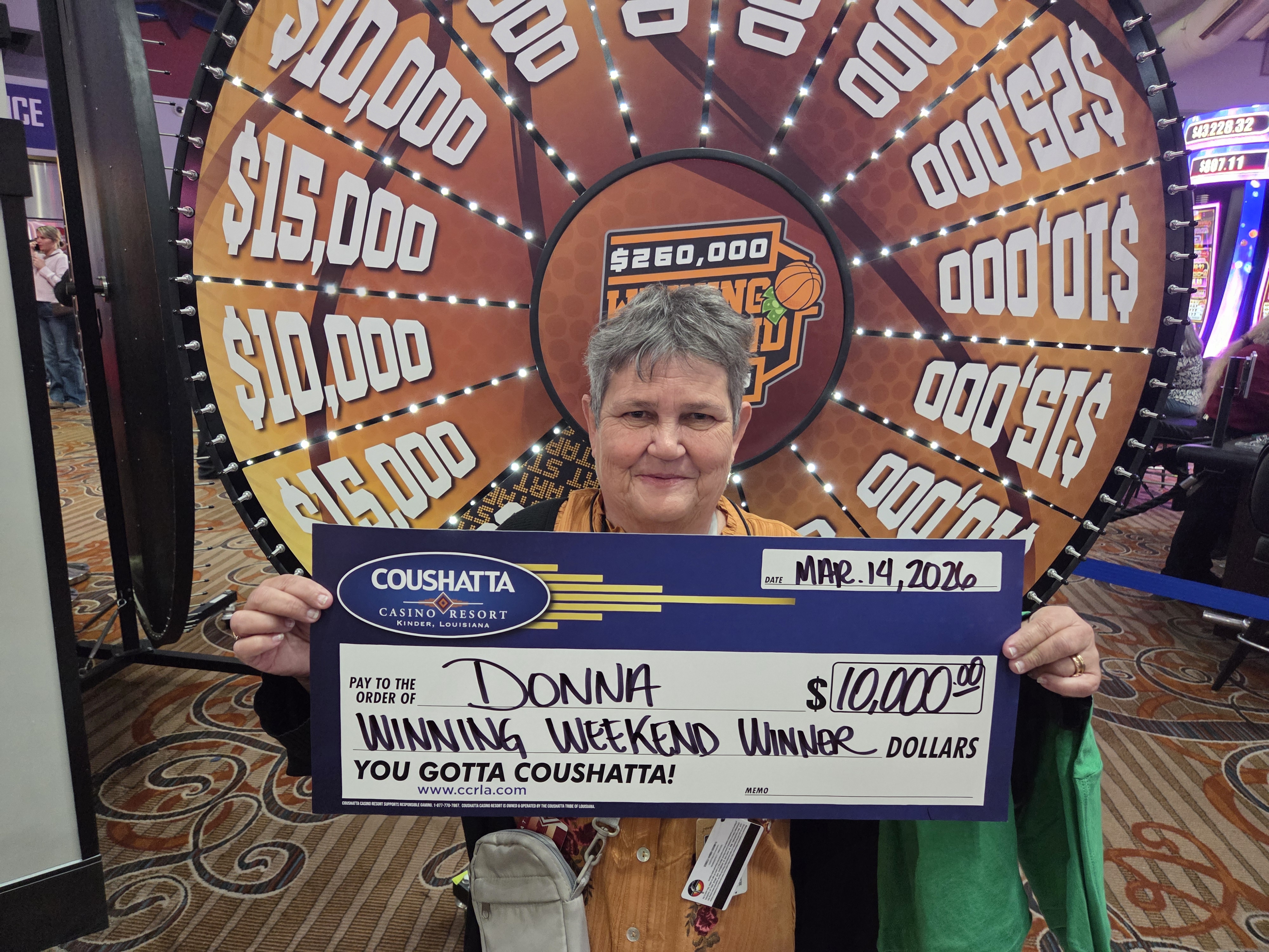 Congratulations to Donna--on March 14, 2026 this lucky guest hit the jackpot while playing in the $260,000 Winning Weekend and won $10,000!