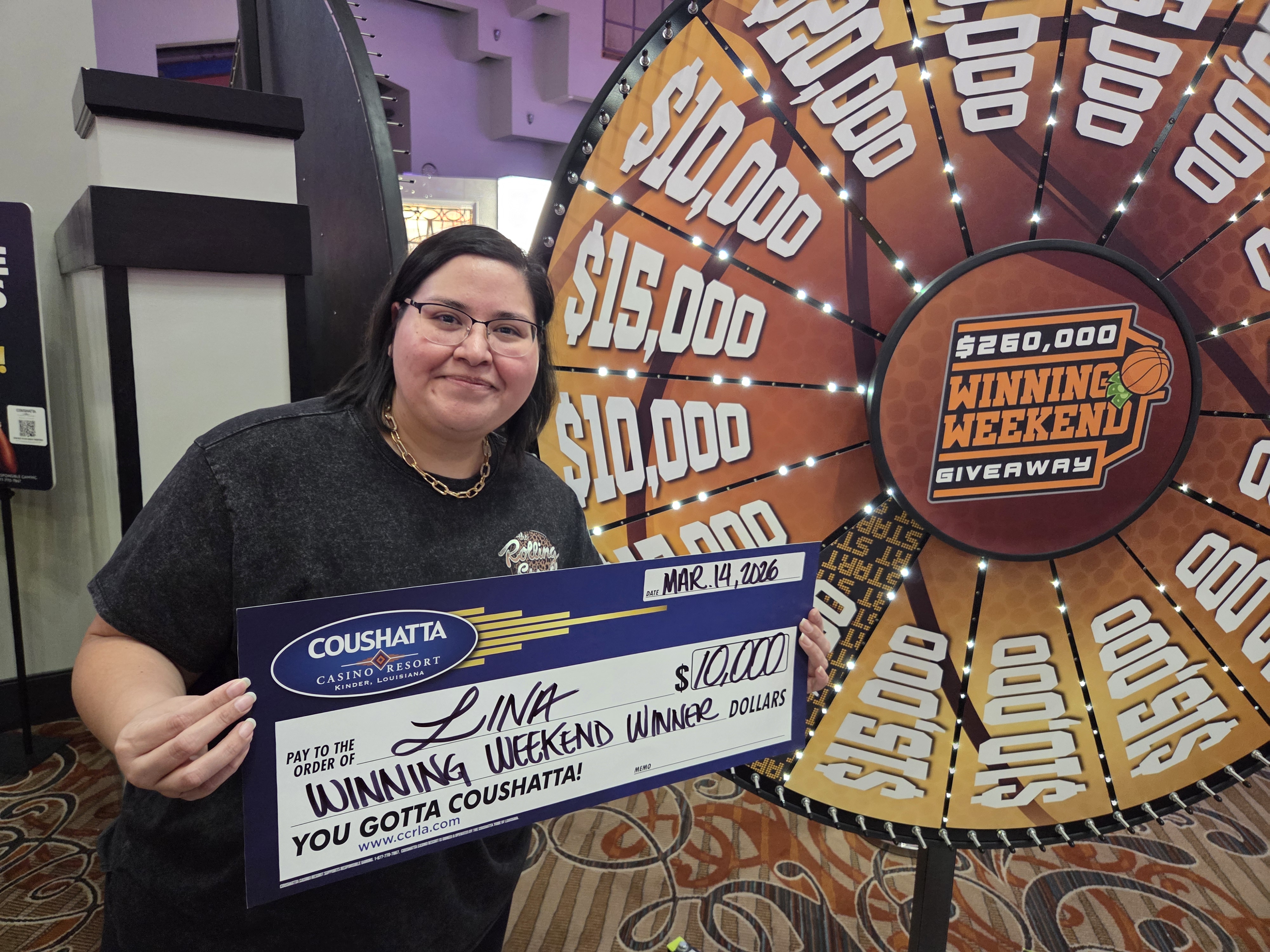 Congratulations to Lina--on March 14, 2026 this lucky guest hit the jackpot while playing in the $260,000 Winning Weekend and won $10,000!
