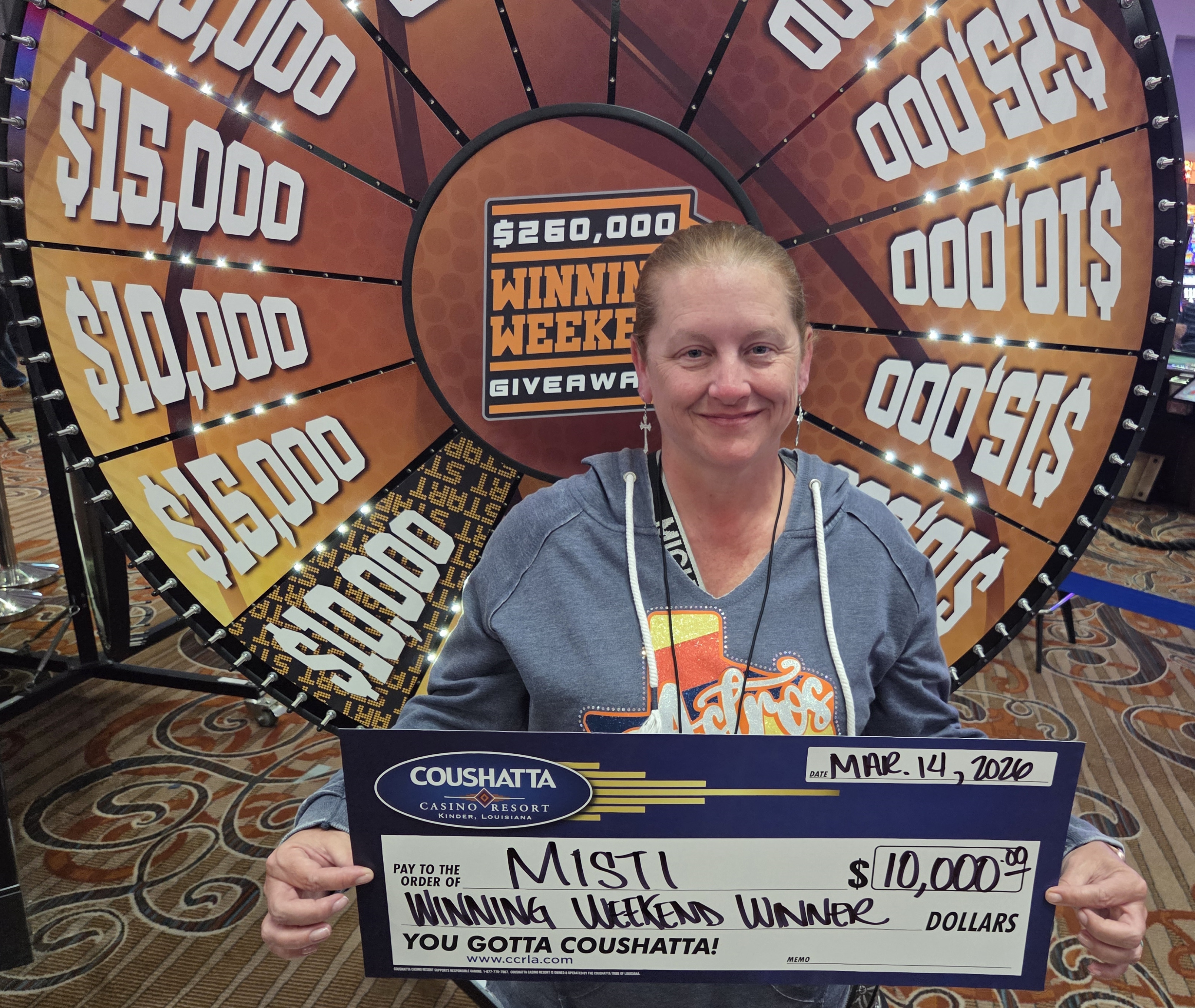 Congratulations to Misti--on March 14, 2026 this lucky guest hit the jackpot while playing in the $260,000 Winning Weekend and won $10,000!