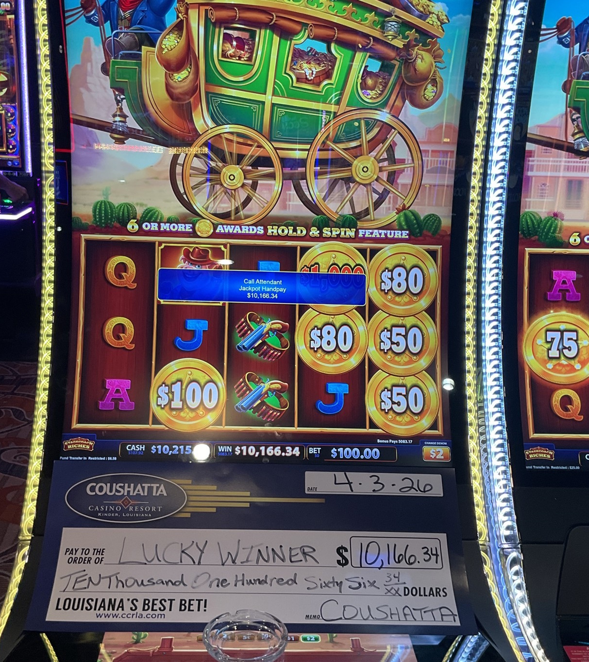 Congratulations to a Lucky Winner--on April 3, 2026 this guest hit the jackpot while playing the Stage Coach Riches slot game and won $10,166!