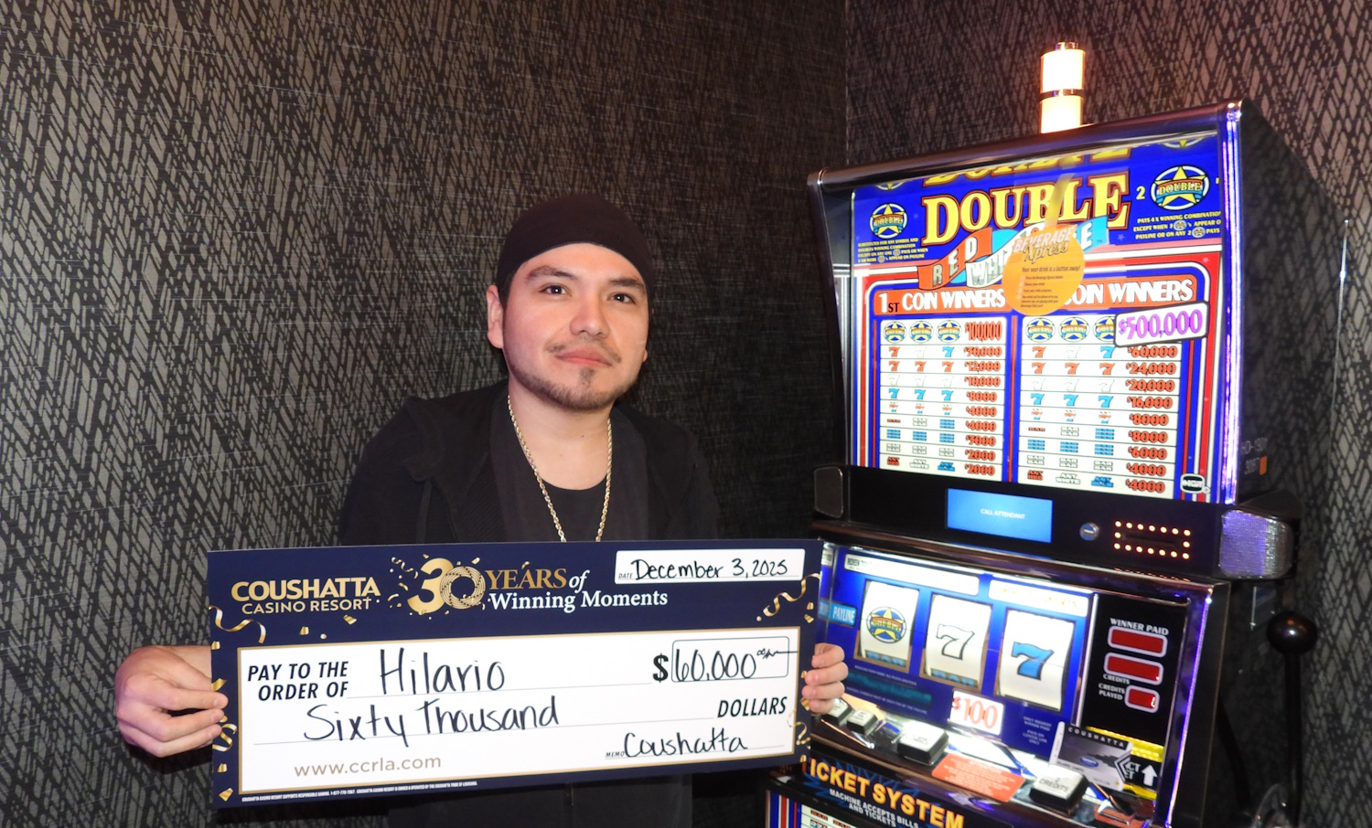 Congratulations to Hilario--on December 3, 2025 this lucky guest hit the jackpot while playing the Double Red White & Blue slot game and won $60,000!