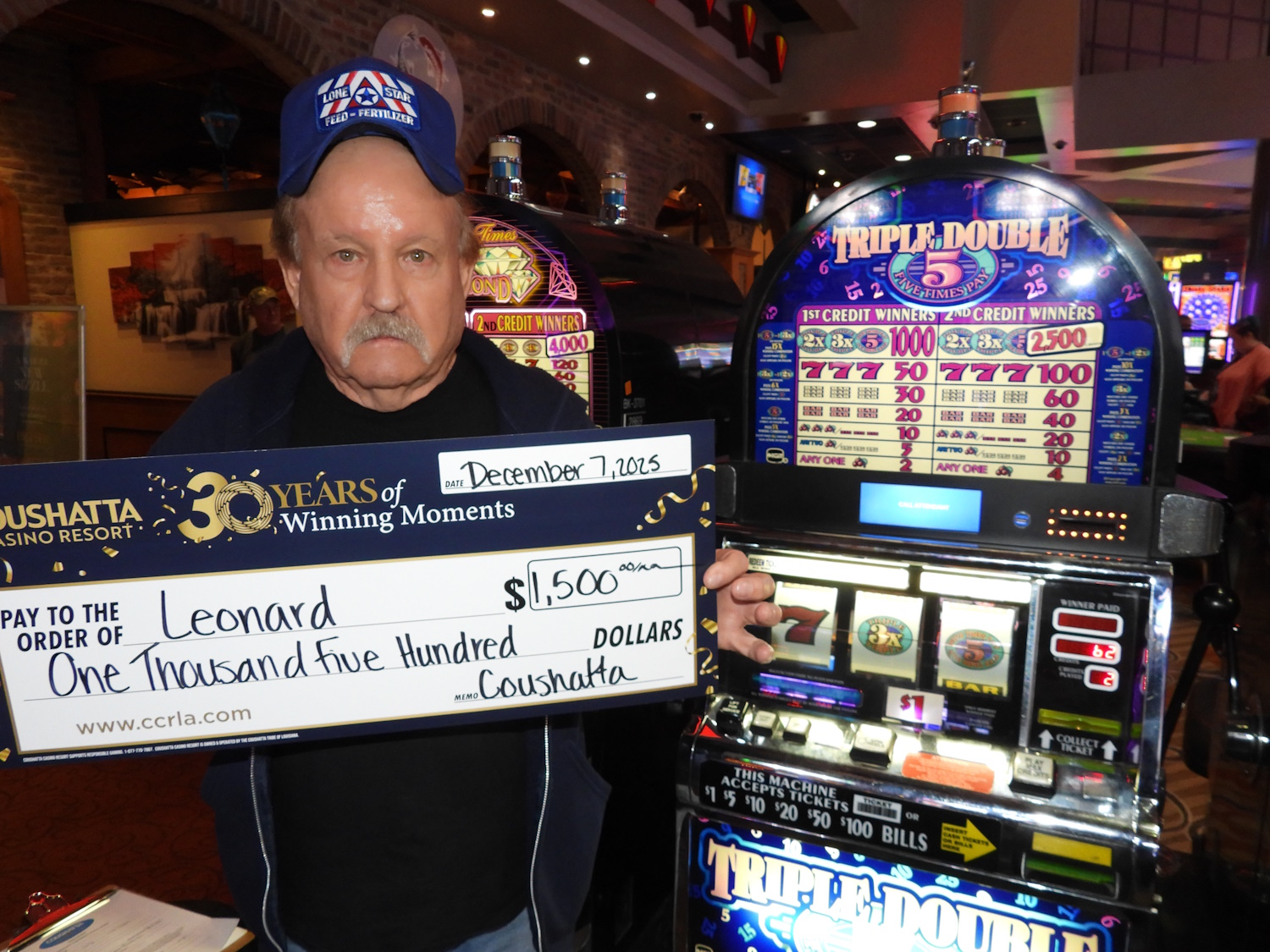 Congratulations to Leonard--on December 7, 2025 this lucky guest hit the jackpot while playing the Triple Double 5 Times Pay slot game and won $1,500!