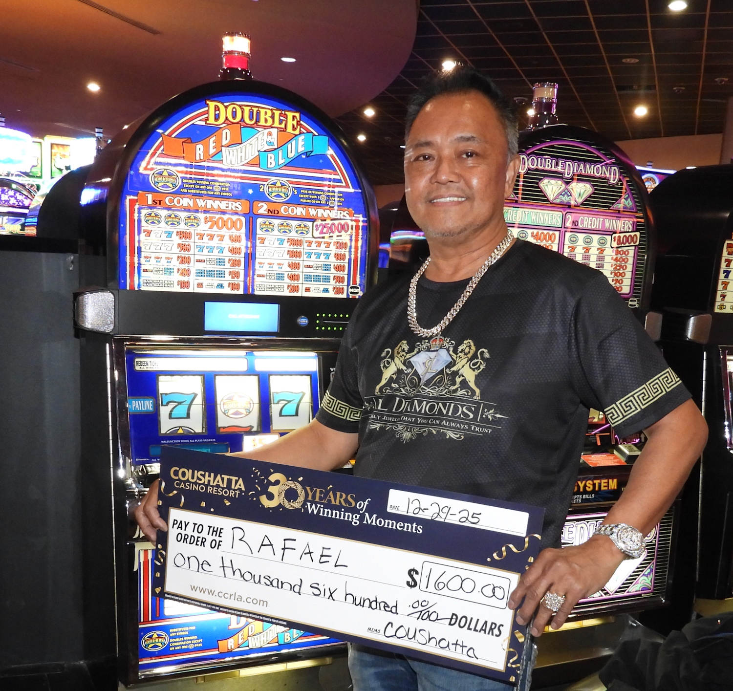 Congratulations to Rafael--on December 29, 2025 this lucky guest hit the jackpot while playing the Double Red White & Blue slot game and won $1,600!