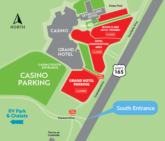 Beginning Wednesday, April 8, the Seven Clans Hotel parking lot (see map) will be temporarily closed for resurfacing improvements. The Seven Clans Hotel Valet will remain accessible throughout the project.